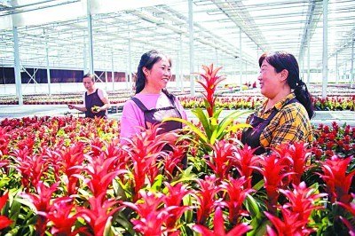 临汾市大宁县现代农业花卉双创示范园内,村民在养护花木。