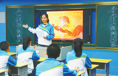 “五四”青年节到来之际,江西省鹰潭高新区在全区青少年中广泛开展弘扬五四精神,传承爱国传统系列活动。图为五月三日,鹰潭高新区第六中学校团委开展诗歌朗诵会及入团宣誓活动。